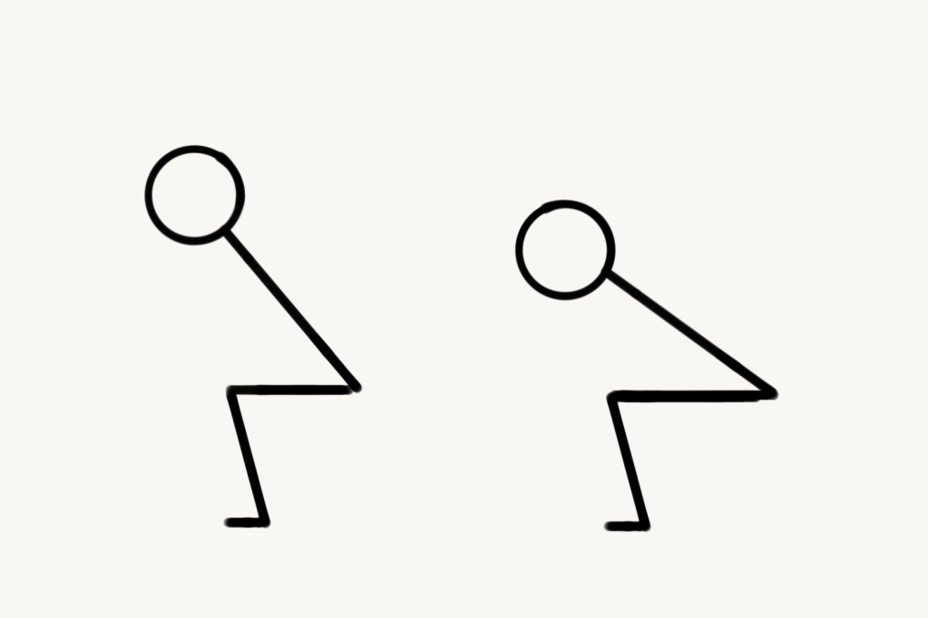 Pour le squat par exemple, en fonction de la longueur du fémur, le recrutement musculaire ne sera pas le même. Des fémurs longs font que le travail des quadriceps sera limité et les fessiers seront plus recrutés que sur une personne avec des fémurs courts. De plus, le sportif aux longs fémurs devra plus se pencher en avant pour garder l’équilibre, ce qui ajoutera une pression sur les lombaires comparé au sportif aux fémurs courts. Je vous ai préparé des dessins pour vous aider à visualiser. Donc attention aux « entraînements magiques » qu’on peut trouver sur les réseaux sociaux et qui vous proposent du squat pour avoir des fessiers bien développés par exemple. Cela n’est pas valable pour tout le monde (en plus du fait que le squat n’est pas l’exercice le plus optimisé pour les fessiers).